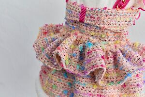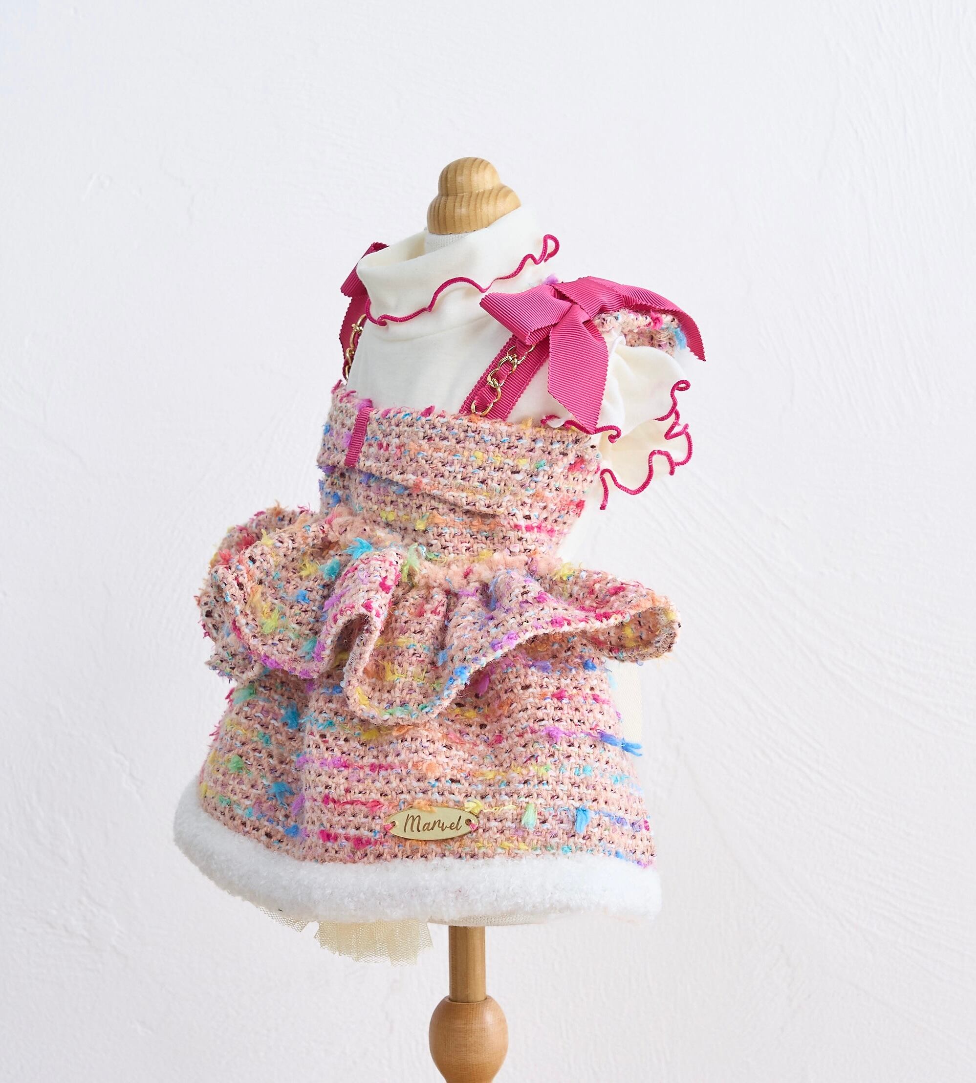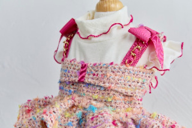 ウエストのボリュームフリル、肩ストラップのチェーン使いがポイント。
