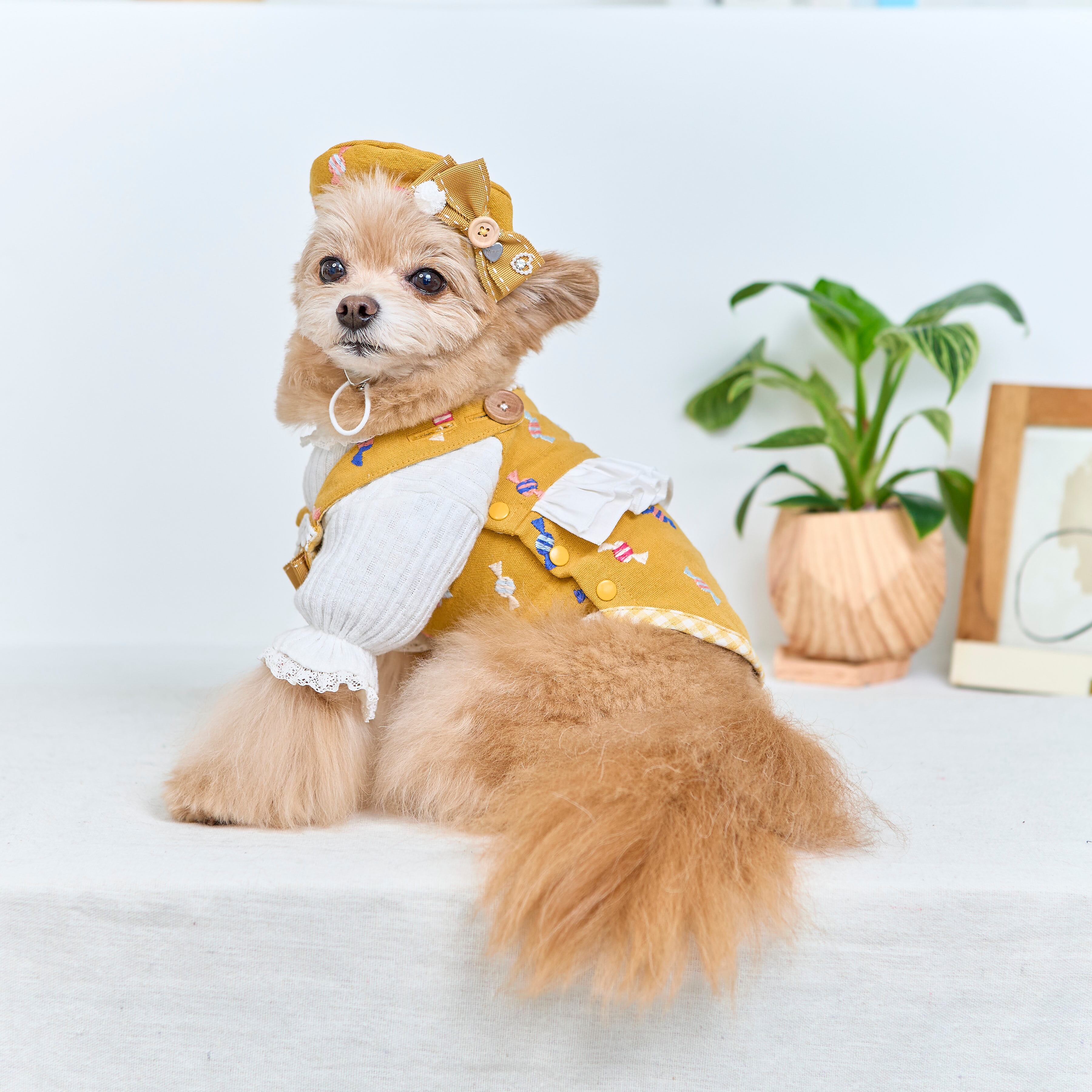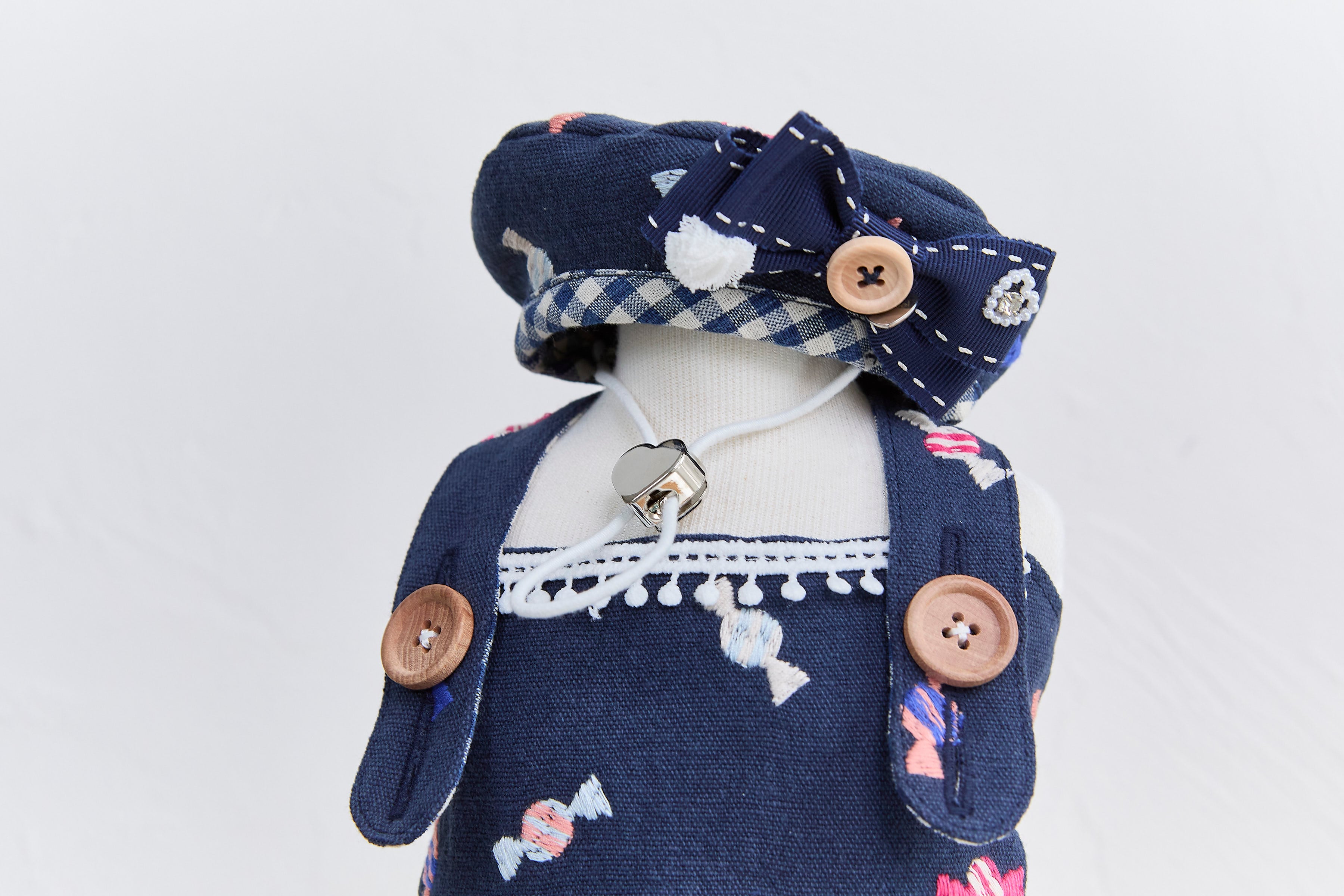 秋冬らしい落ち着いた色味にカラフルなキャンディ柄が刺繍されたオーバーオール風。