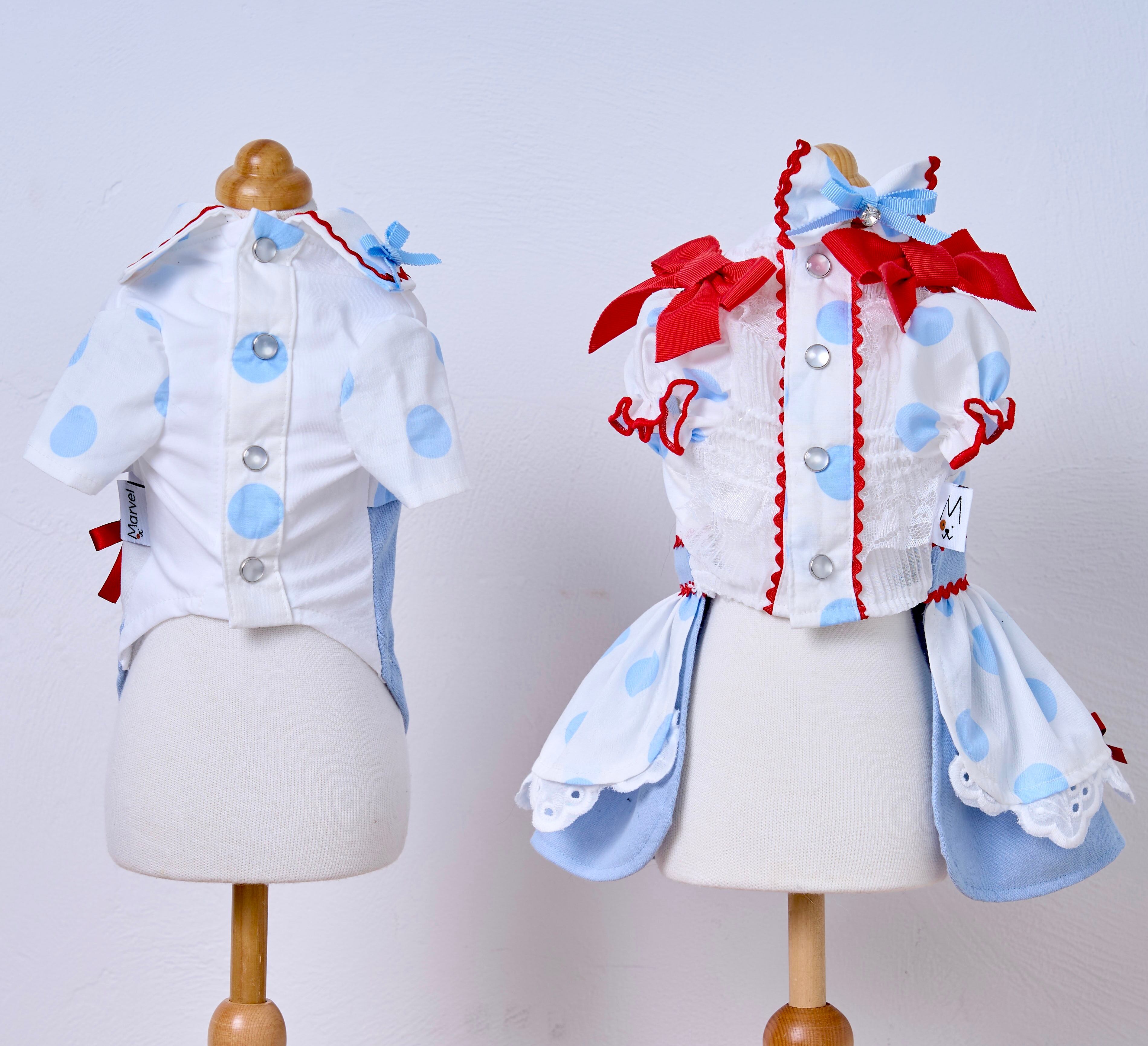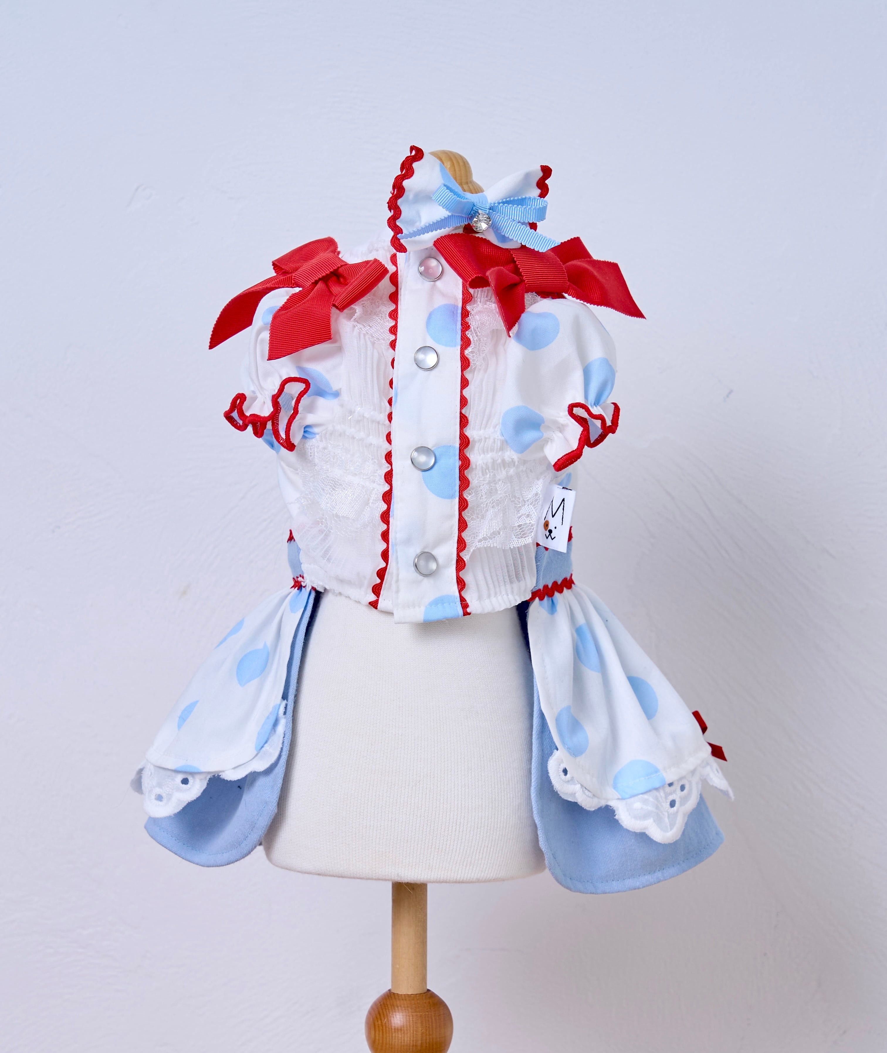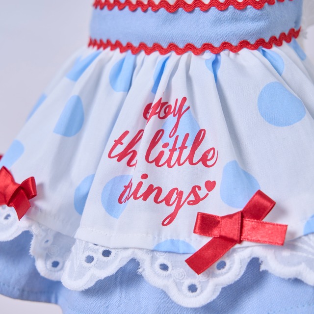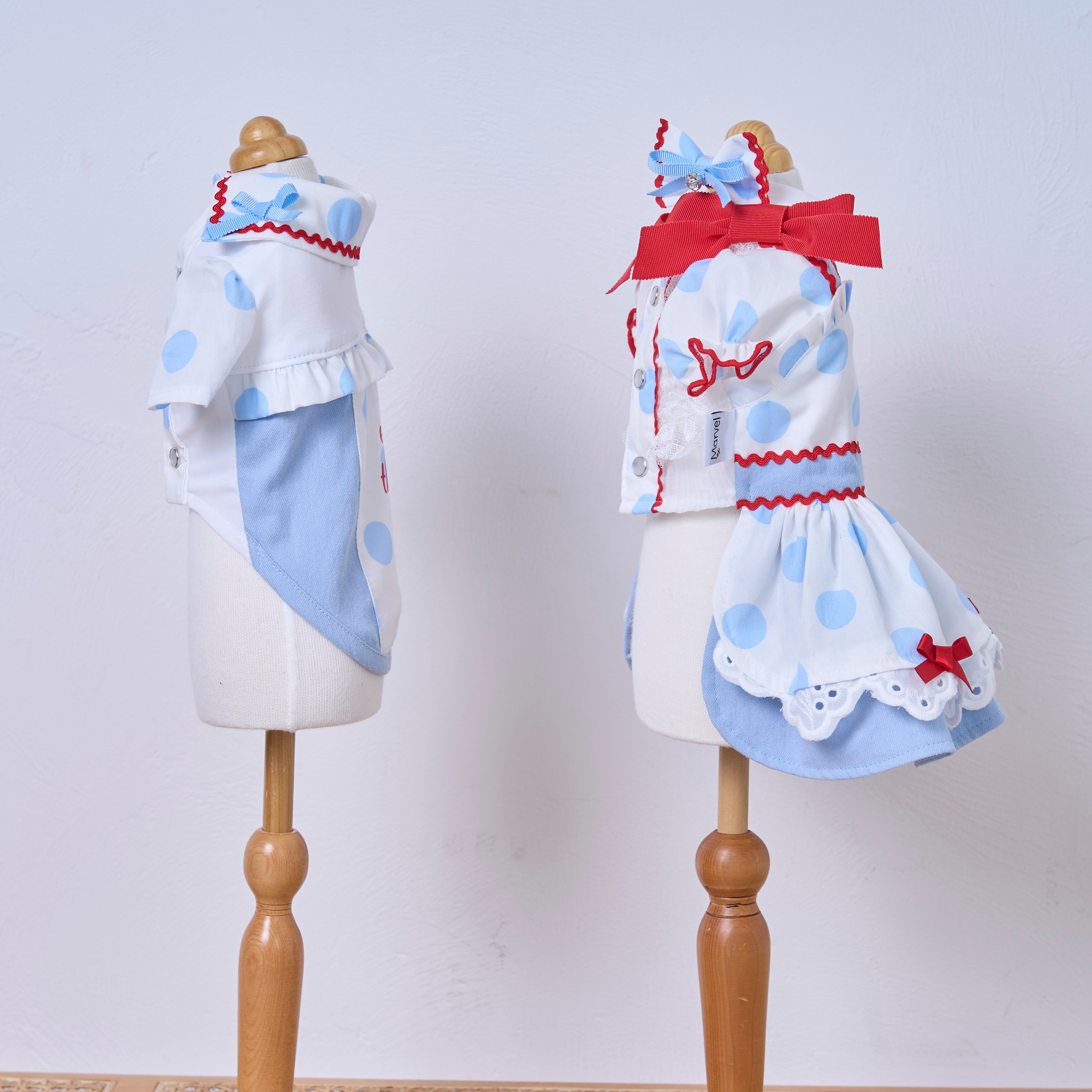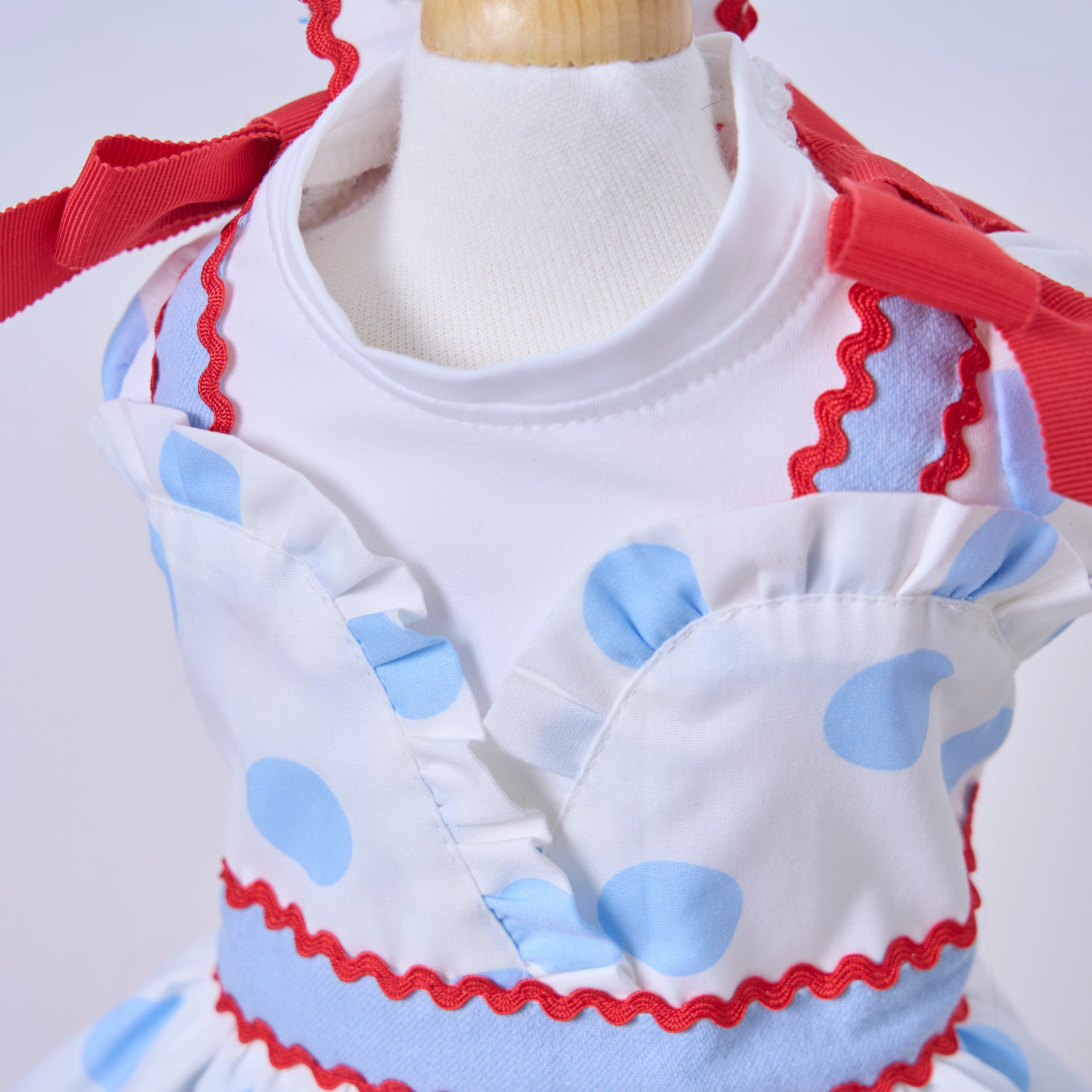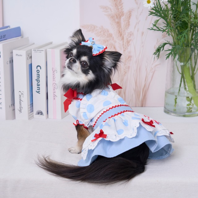 ドット柄×アイスブルーを組み合わせたカシュクールスタイルのふんわりボリュームスカート