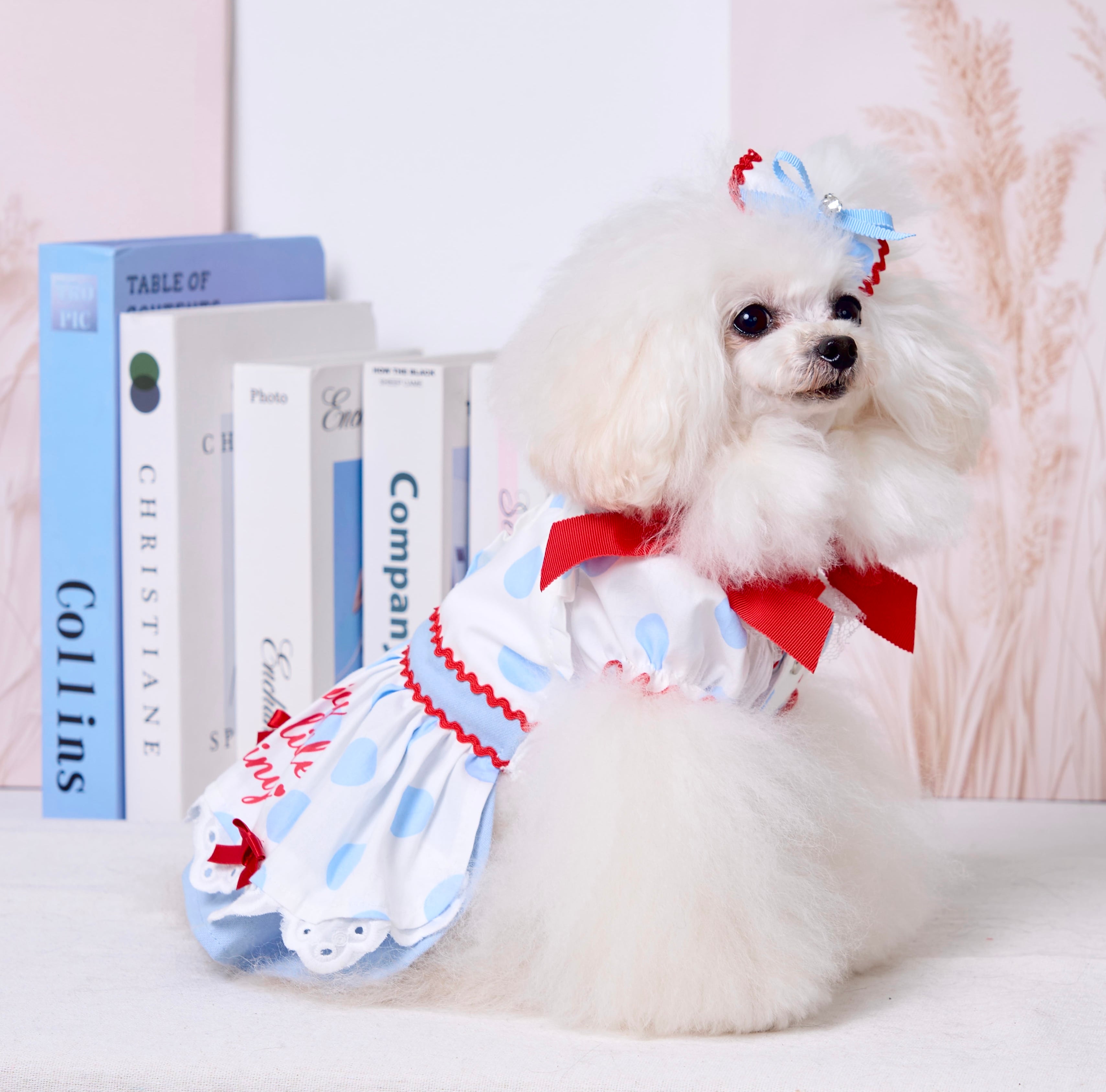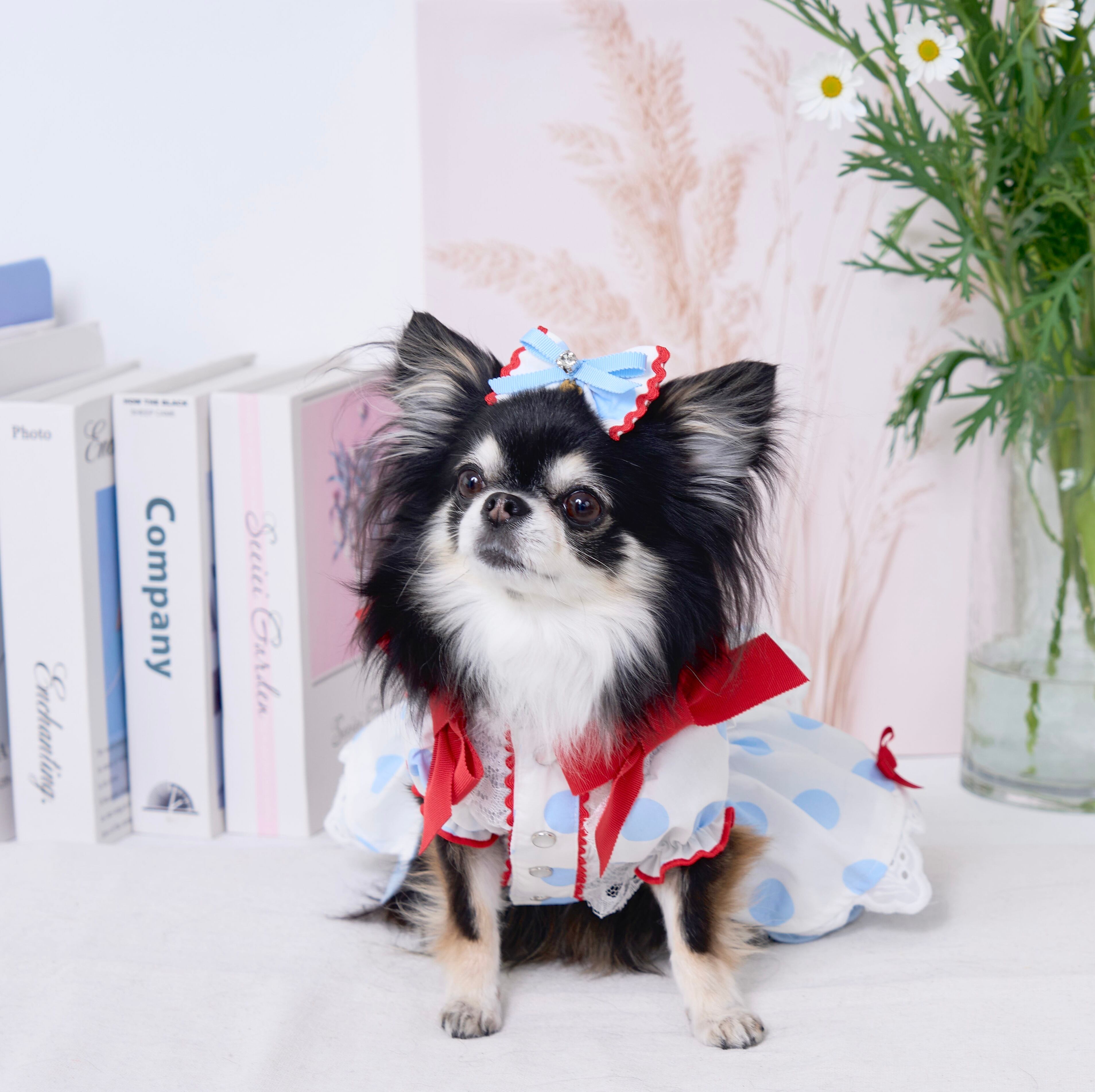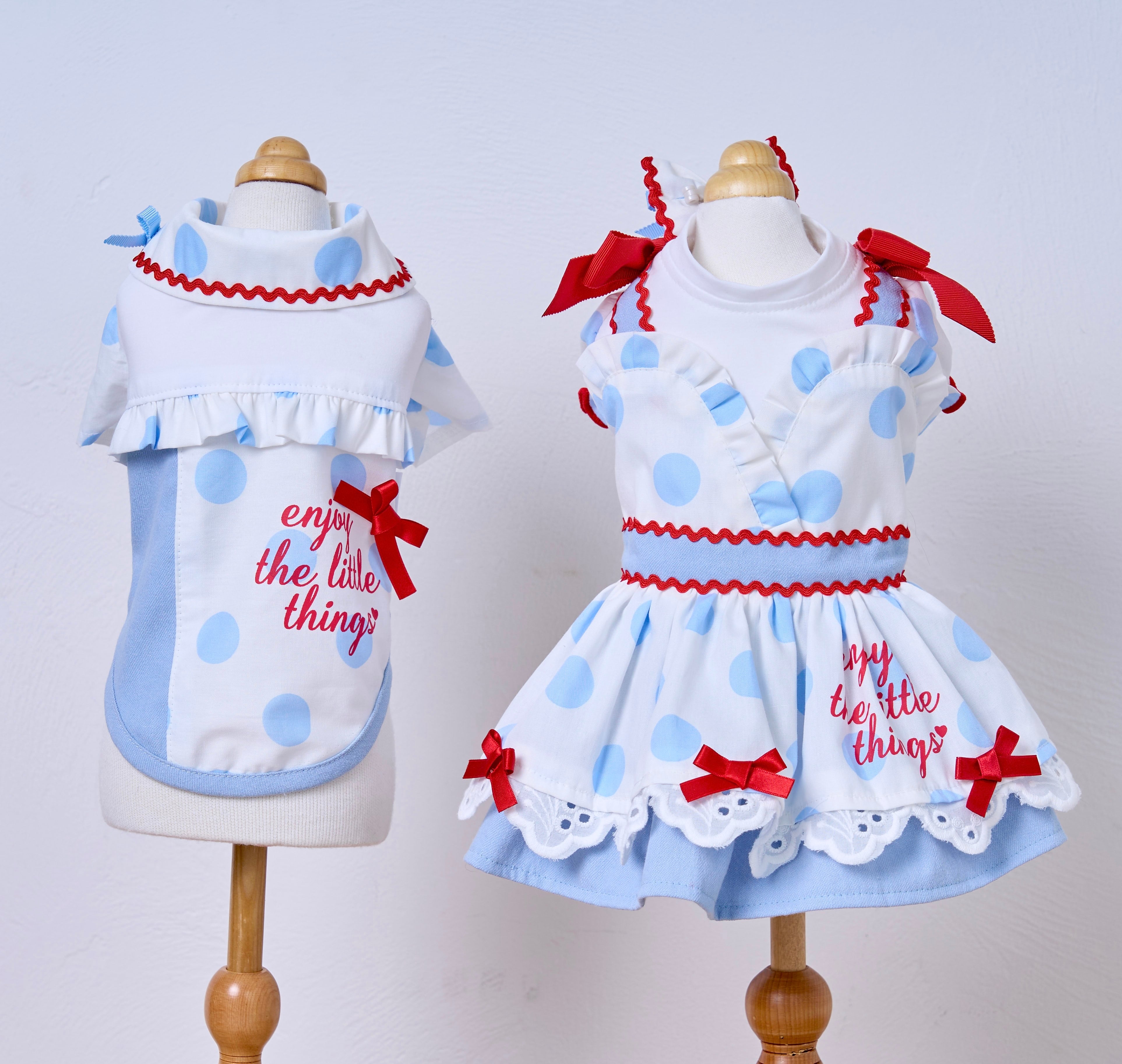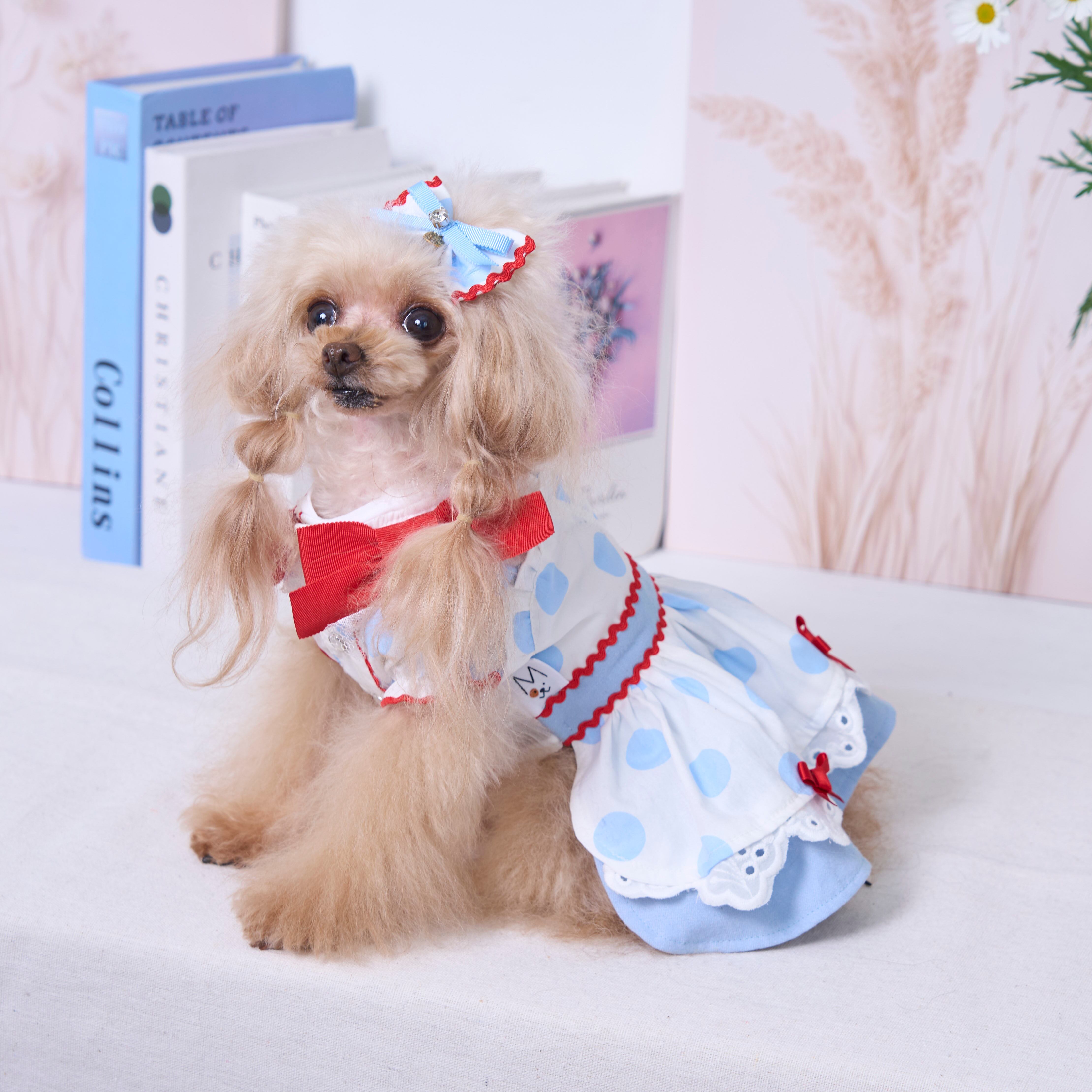 ドット柄×アイスブルーを組み合わせたカシュクールスタイルのふんわりボリュームスカート