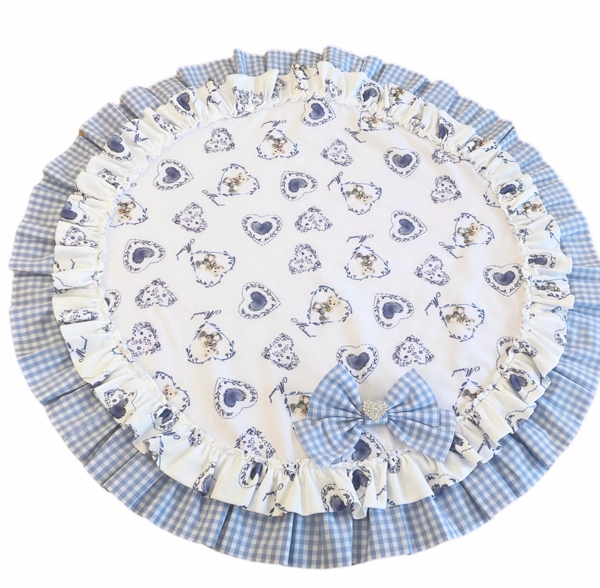 お洋服と同じように、フリルをたっぷりあしらい、裏面はホワイトのサテンキルティング生地で合わせやすい仕様にしております。