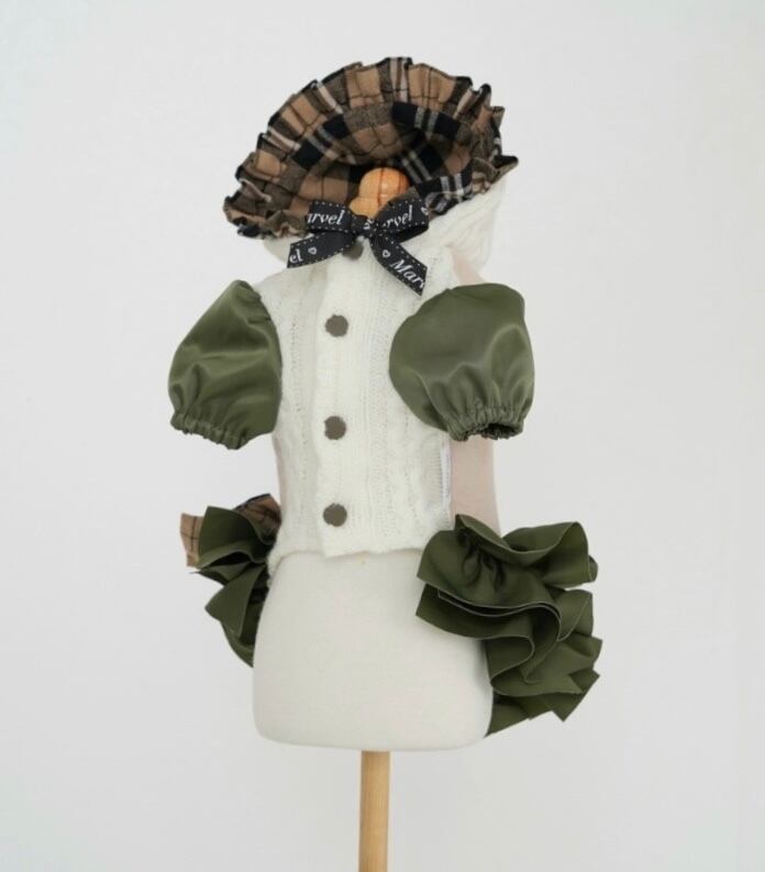 メンズライクなカーキ色のハリのあるMA-1素材をスカートとお袖に用い、たっぷりボリュームフリルの甘さとパフスリーブの丸みのあるシルエットが甘辛MIXなマルベルスタイル♪