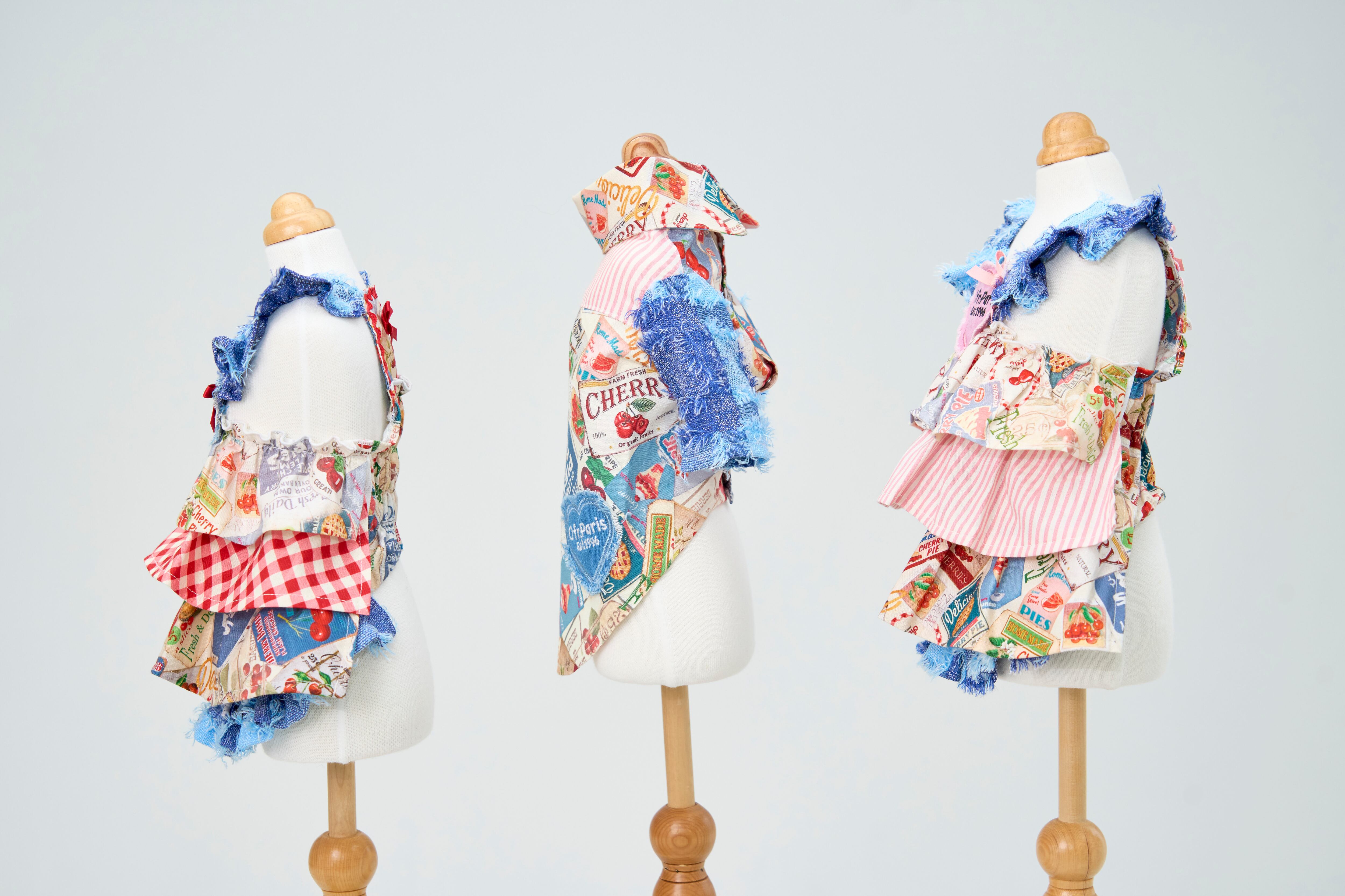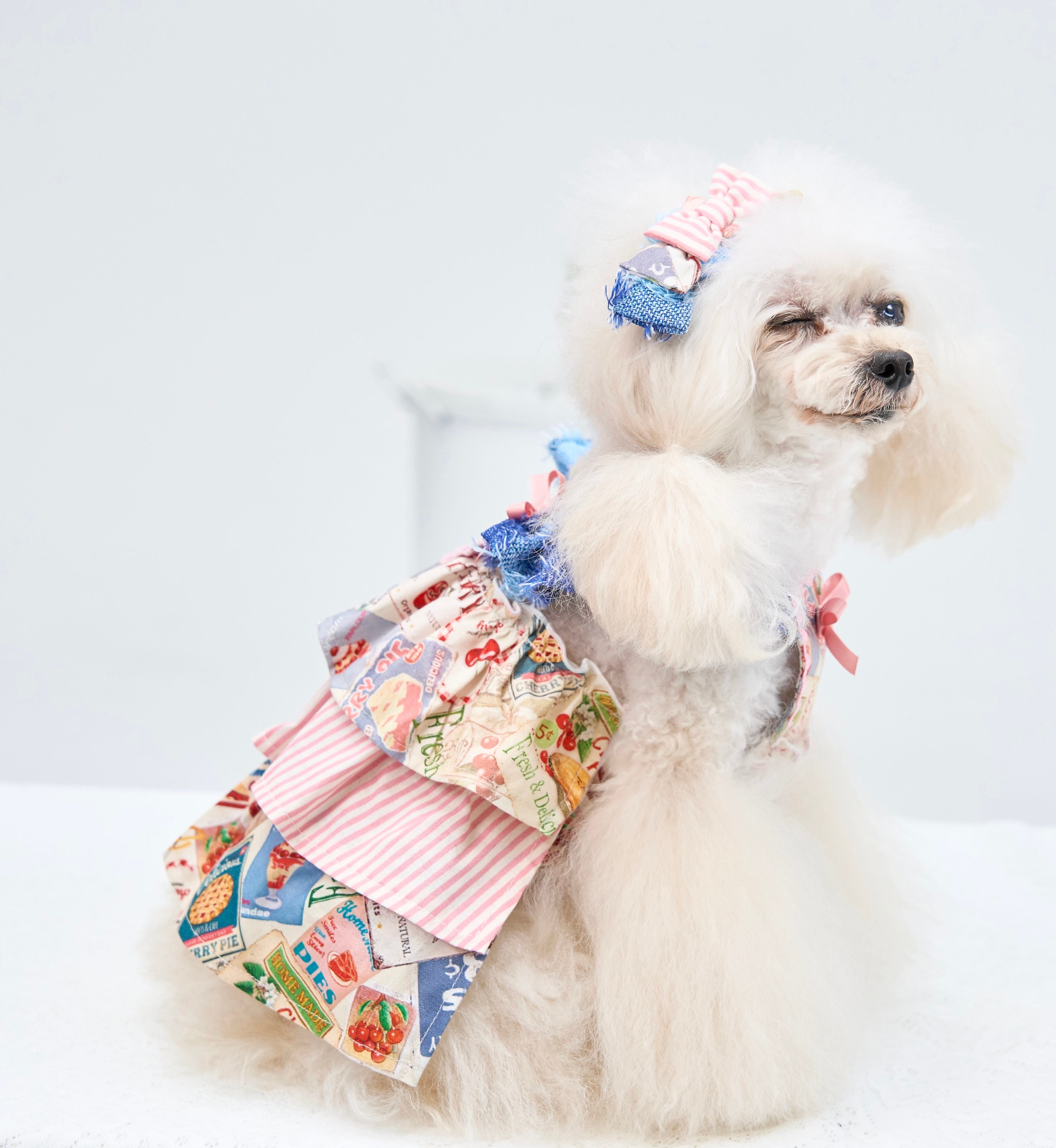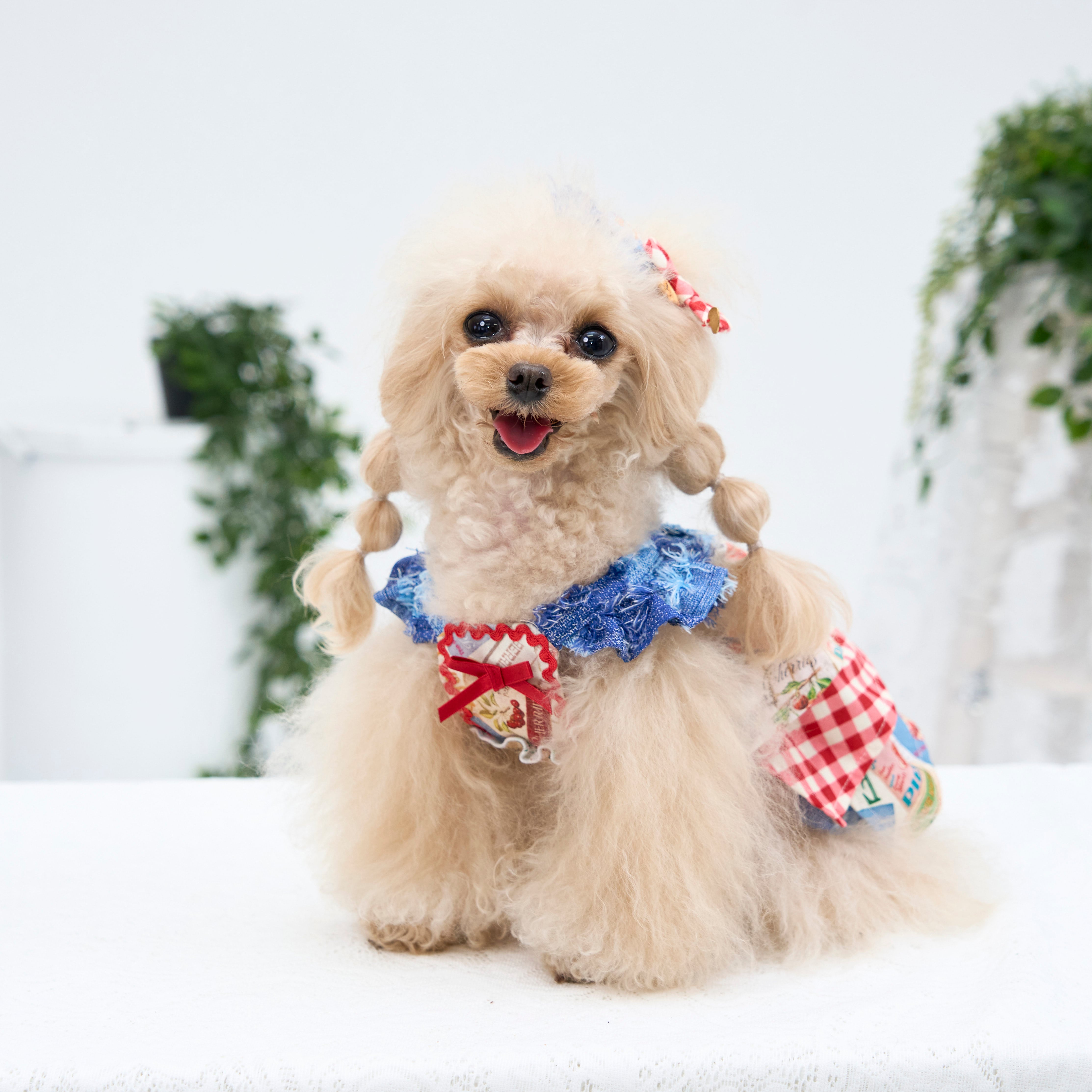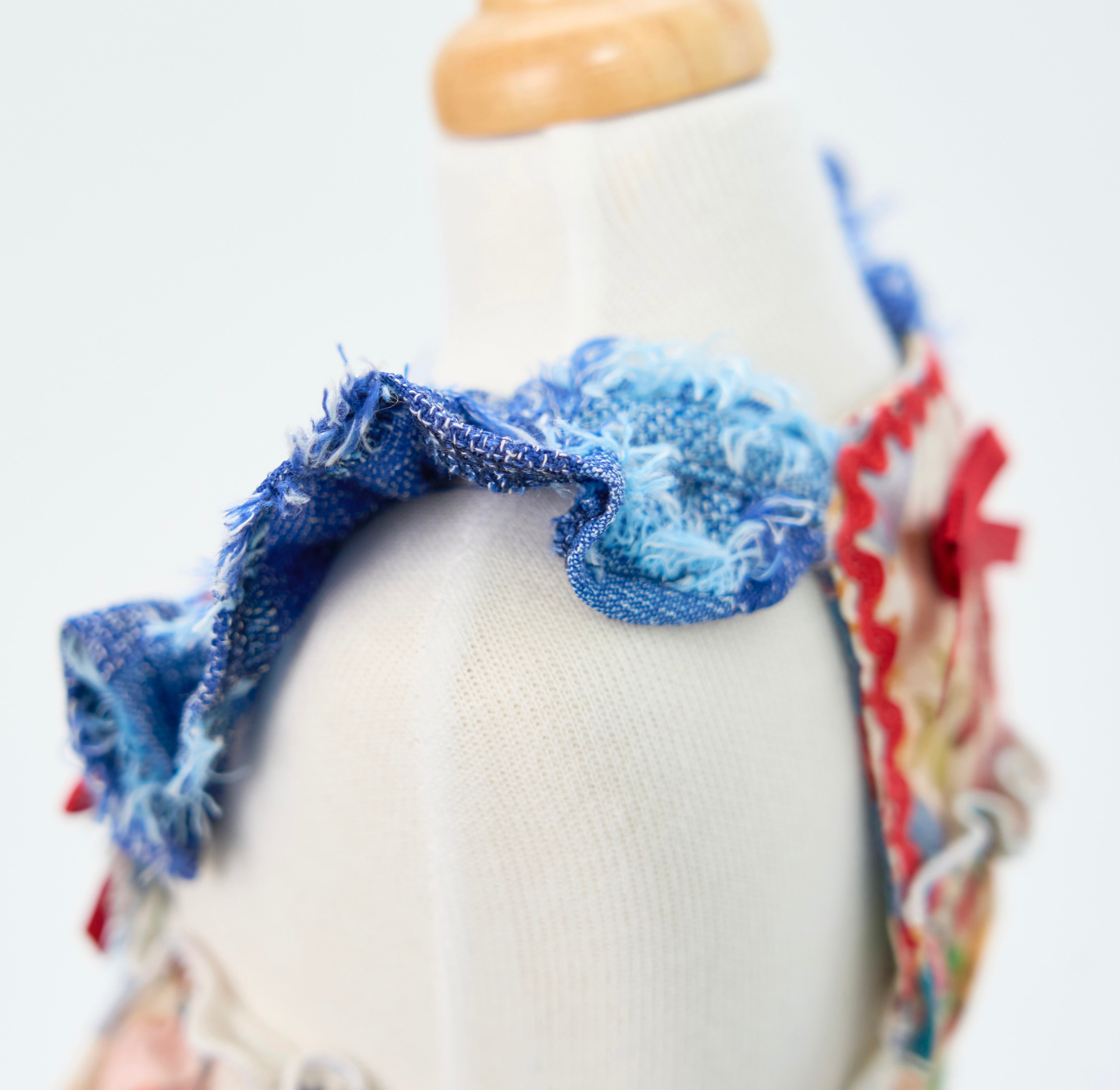 チェリーやアップルパイetc...の可愛いインポート生地×フリンジ加工された柔らかく薄手のデニム×ピンクストライプ、赤ギンガムチェックをMIXさせたエプロン風ティアードワンピースです♪