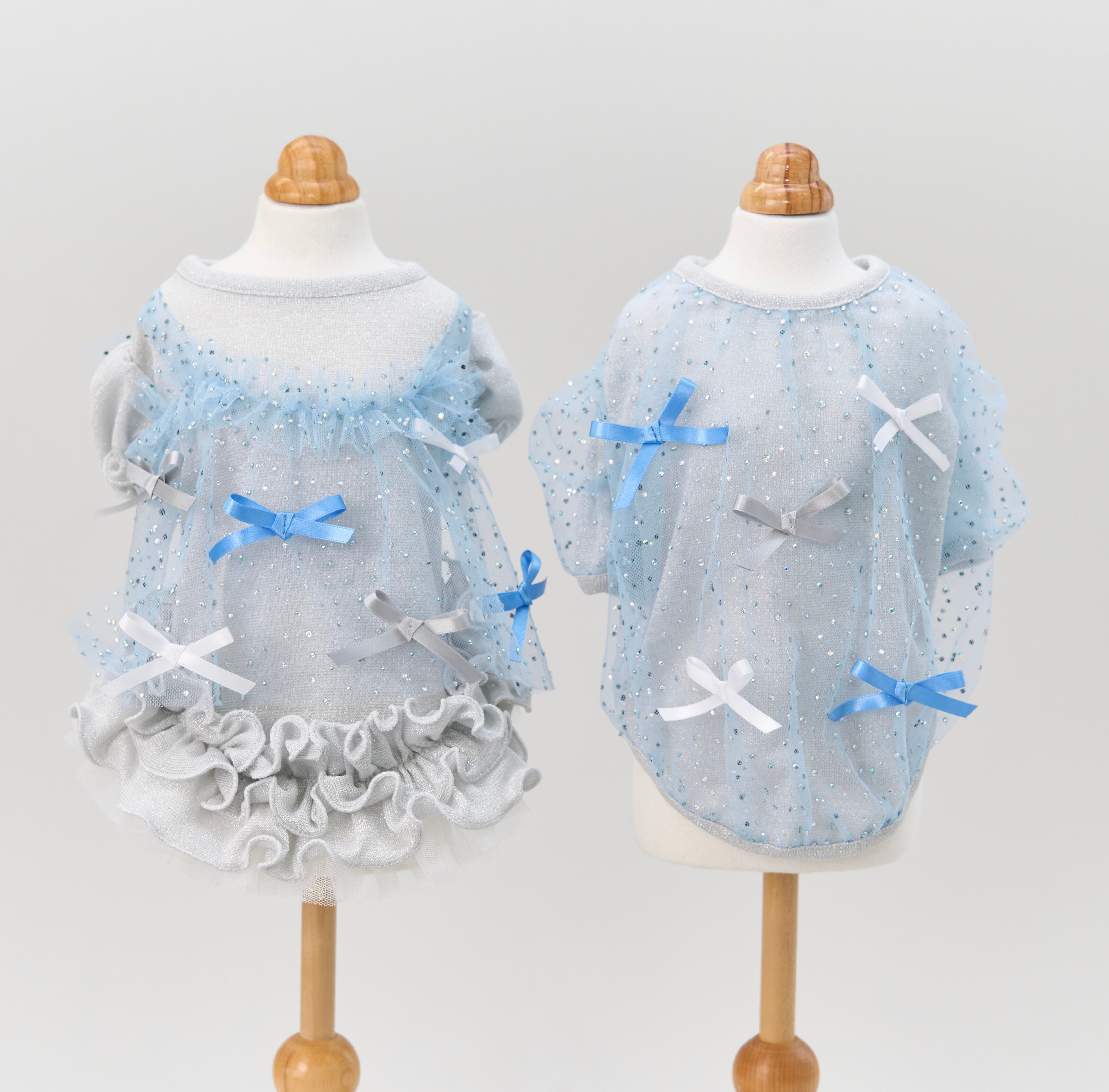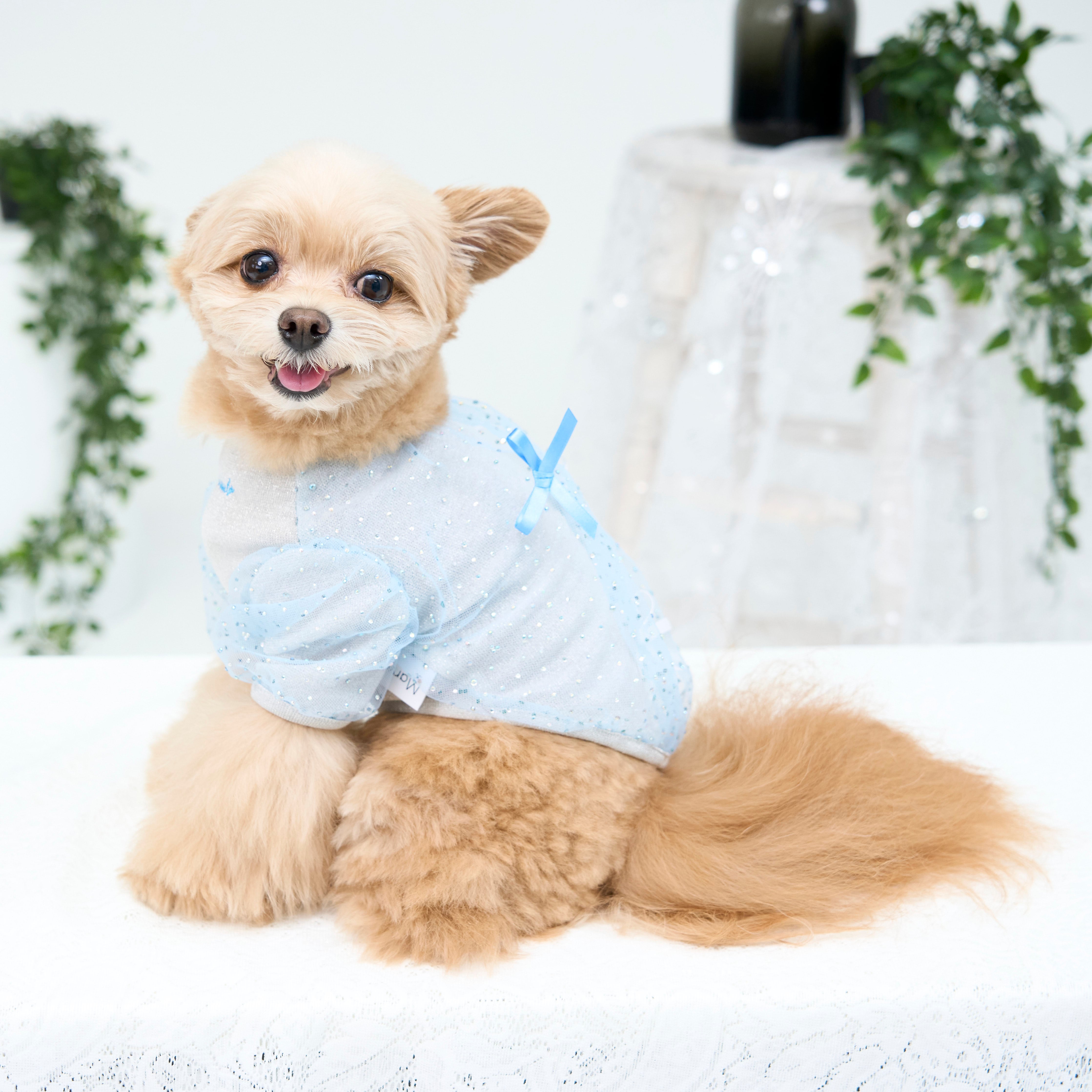 水色のチュールには全面にラインストーンが施され、光の下でキラキラと美しい輝きを放ちます★