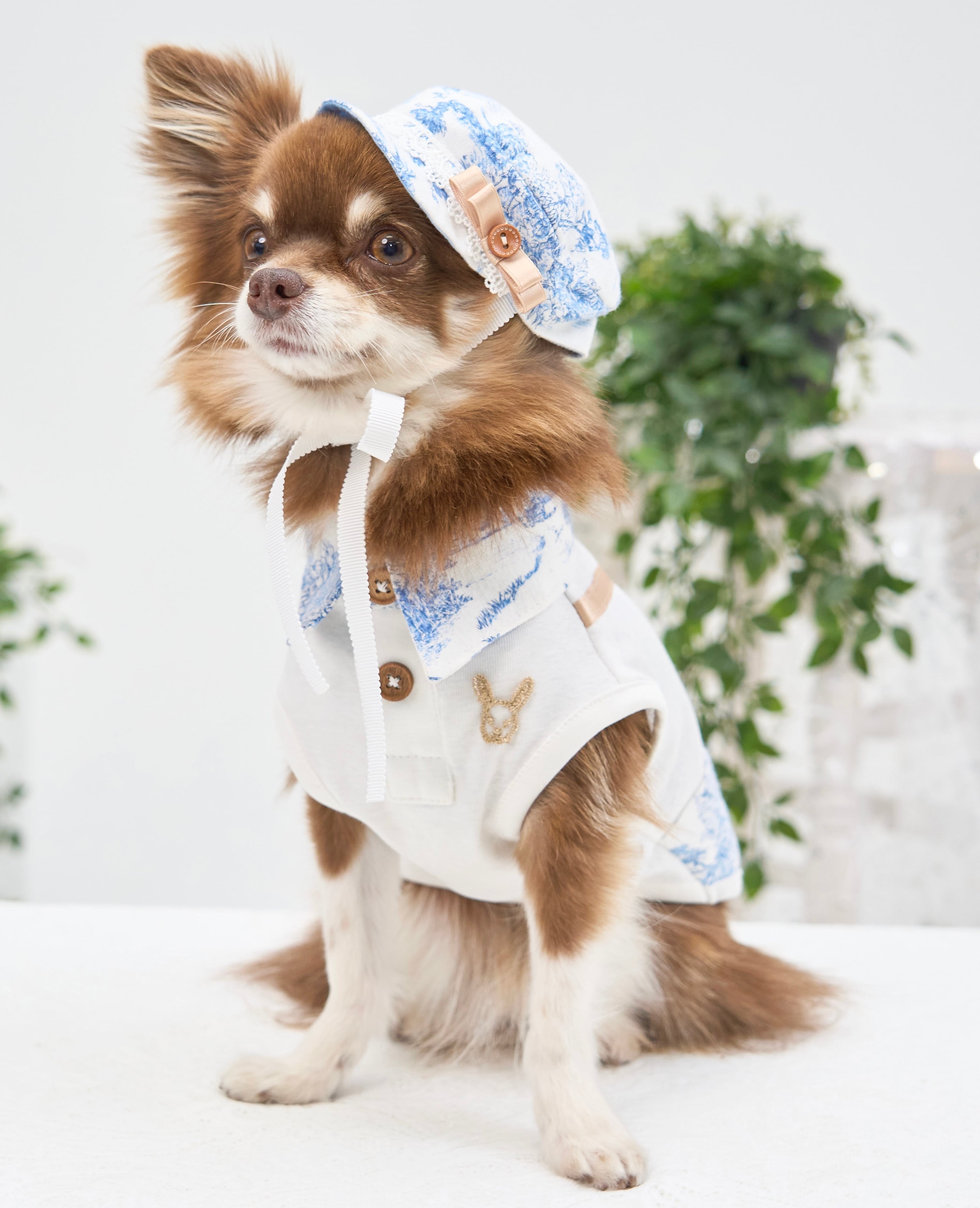 トワルドジュイ生地を主役にしたサスペンダー風タンク。